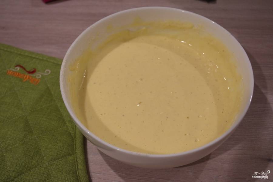 Теперь просеиваем муку, вводим ее в тесто. Всю массу хорошо вымешиваем. Масса будет жидкой, близкой по консистенции к тесту для оладьев.