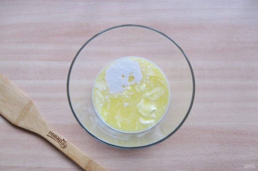 После влейте немного охлажденное, растопленное сливочное масло. Добавьте соль, ванильный сахар и еще 4 столовые ложки сахара.