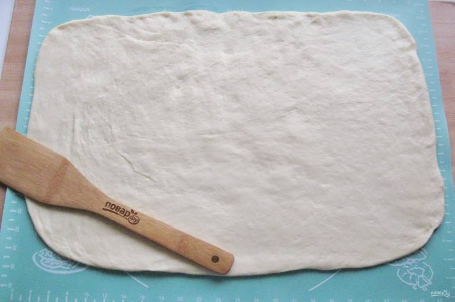 Достаньте тесто из миски, обомните и раскатайте в прямоугольный пласт.