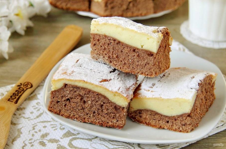 Очень вкусный и нежный пирог из шоколадного теста с творогом. Выпечка получается пышная и невесомая. Смотрится эффектно и в разрезе пирог больше похож на пирожные.
