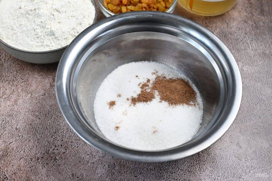 В отдельную миску высыпьте сахар, добавьте корицу.