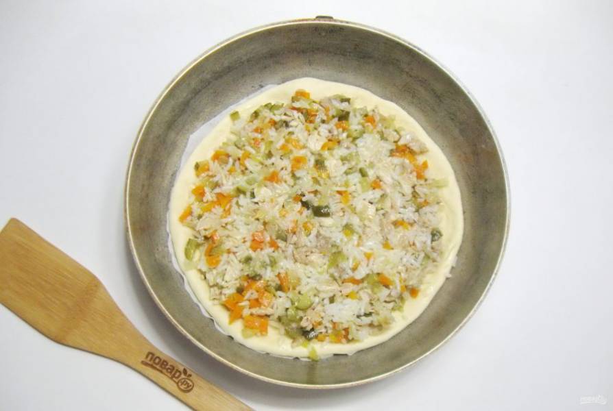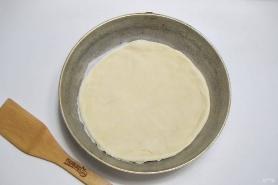 Тесто разделите на две неравные части. Большую часть раскатайте и выложите в сковороду с пекарской бумагой.