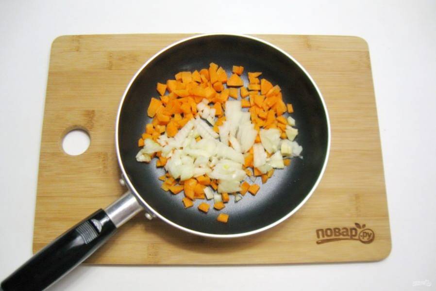 Пока тесто подходит, займитесь начинкой. Репчатый лук и морковь нарежьте и выложите в сковороду.