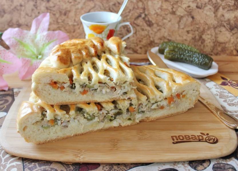 Сдобный пирог "Рассольник" готовят с начинкой из мяса птицы, лука, моркови, соленых огурцов и риса. Вкусно в теплом и холодном виде.