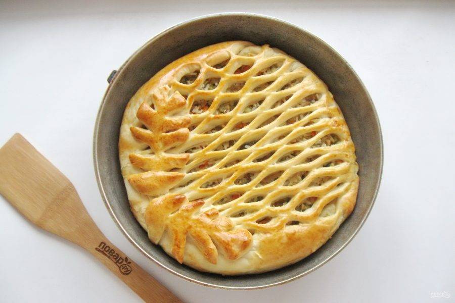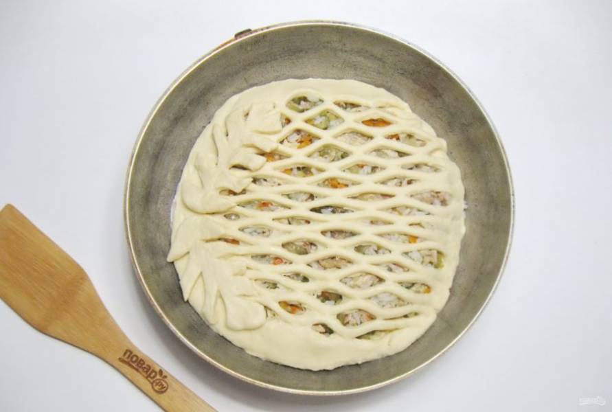 Вторую часть теста раскатайте и сделайте сеточку. Накройте ею начинку и соедините края пирога.