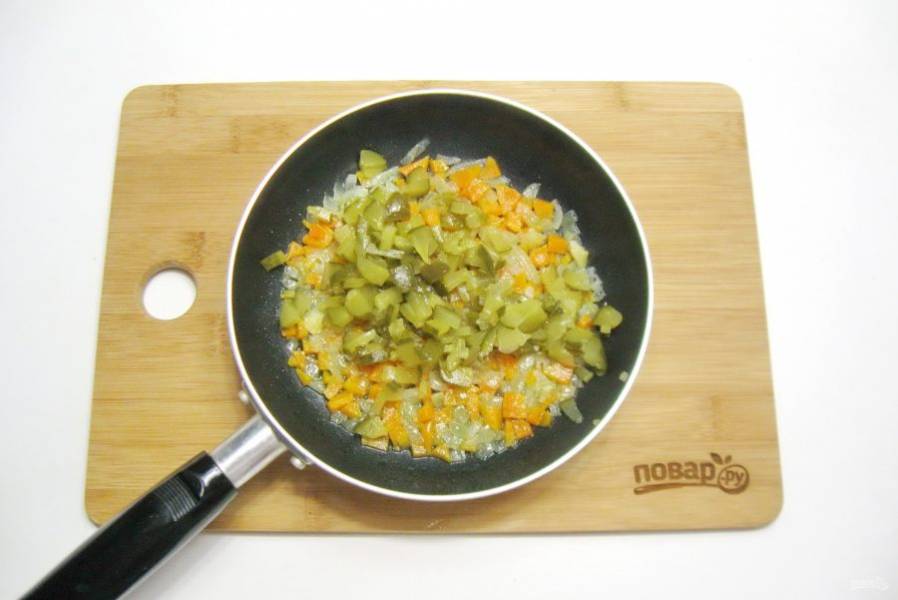 Добавьте нарезанный маринованный огурец. Тушите овощи еще 10 минут.