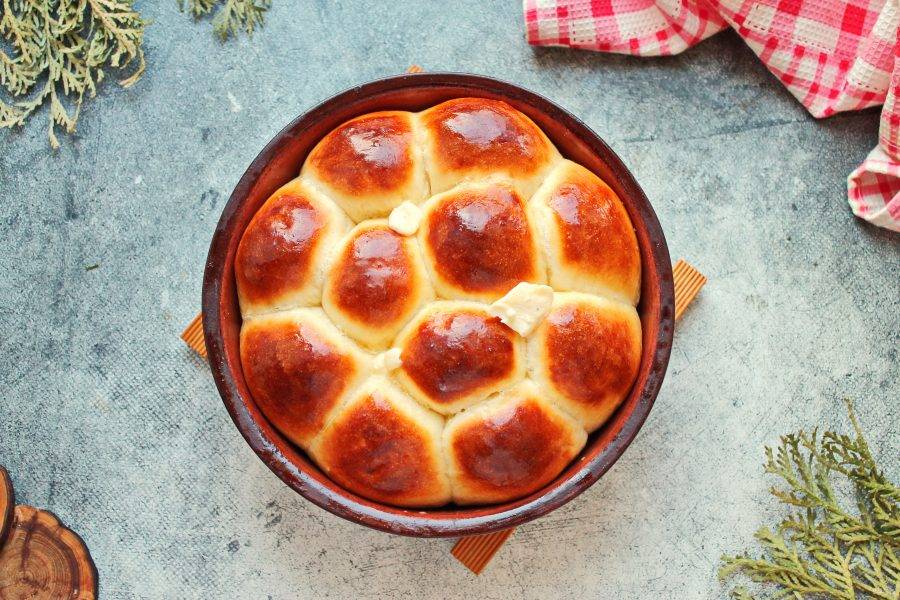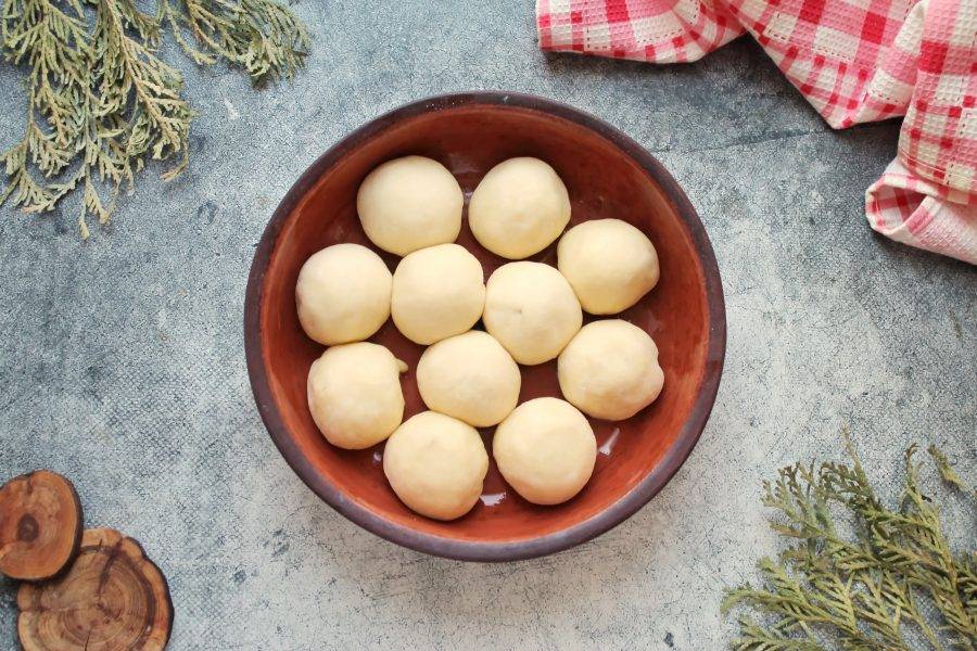 Форму для выпечки смажьте растительным маслом и выложите шарики на расстоянии. Оставьте на 20-25 минут, смажьте перемешанным яйцом.