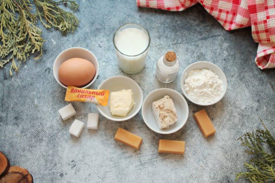 В миску влейте теплое молоко, растопленное масло и разбейте яйцо. Всыпьте в миску сахар, соль, раскрошите дрожжи и всыпьте ванильный сахар. Все хорошо перемешайте до растворения и однородности.