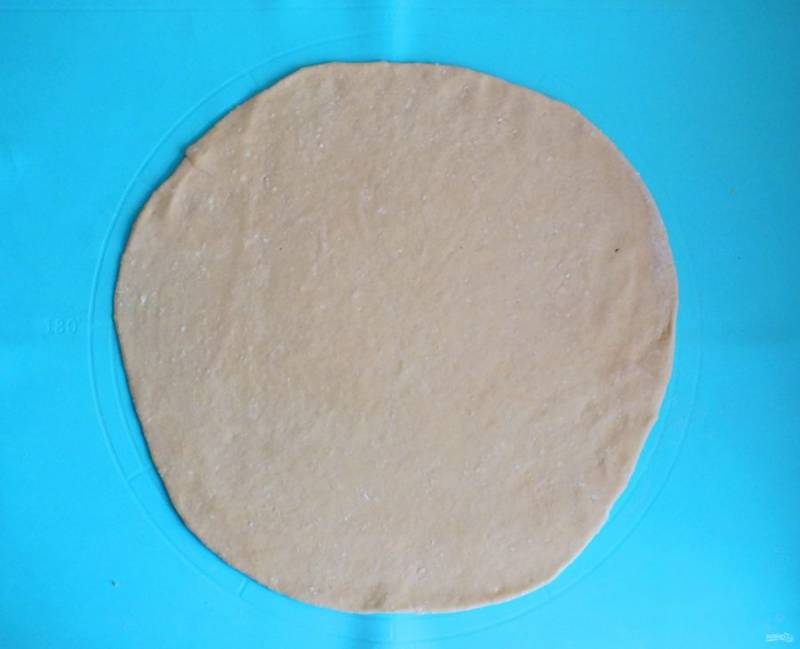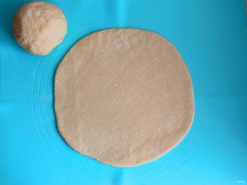 Раскатайте меньшую часть теста в пласт. Ориентировочный диаметр 32 см.