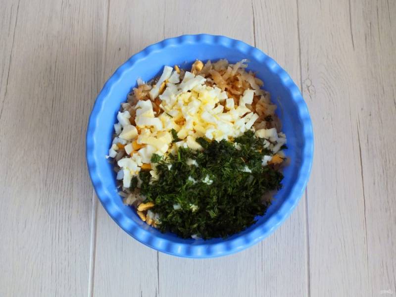Подготовьте начинку. Обжаренную капусту смешайте с отварными рубленными яйцами и измельченным укропом. Если начинка получилась суховатой, растопите 50 грамм сливочного масла и добавьте к начинке. Перемешайте.