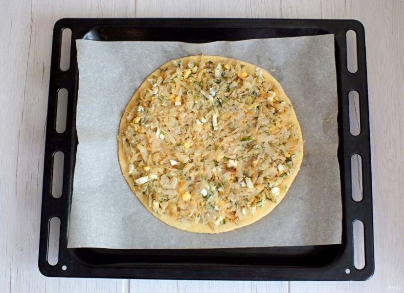 На противень постелите пергамент, переложите раскатанное тесто. Разложите подготовленную начинку. Включите духовку на 180 градусов.