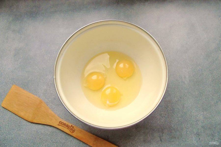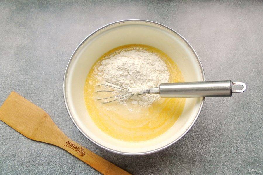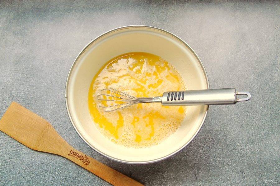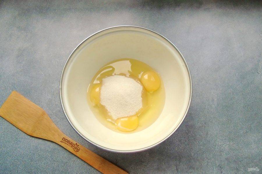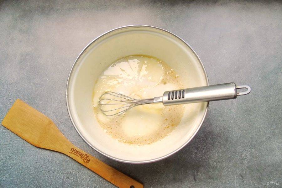 Насыпьте сахар и ванильный сахар. Взбейте немного венчиком.