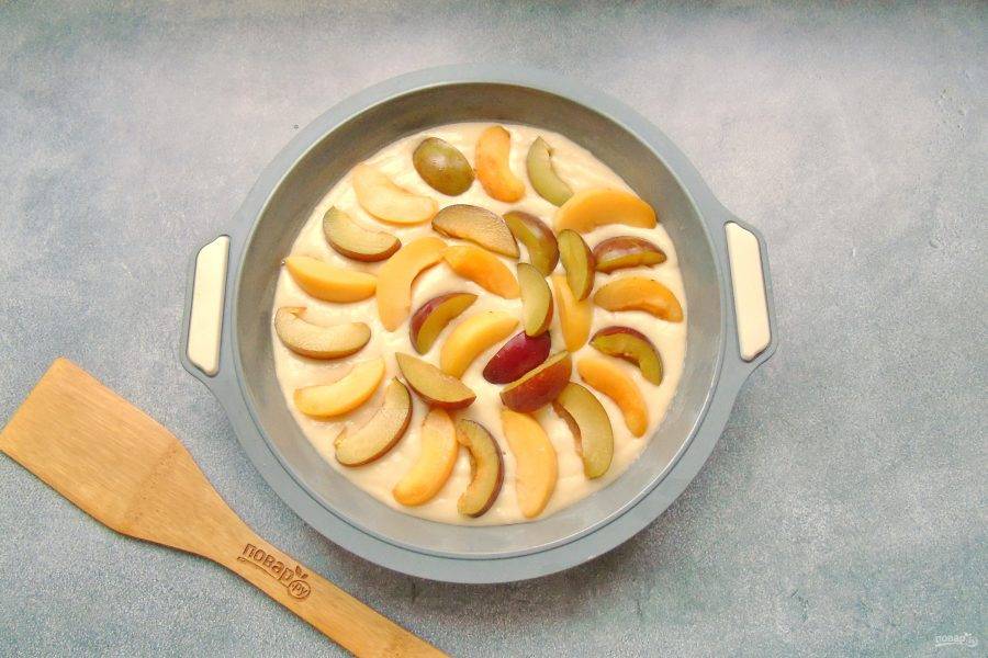 Абрикосы и сливы помойте, удалите косточки и нарежьте дольками. Выложите тесто в форму для выпечки. Поверх теста разложите фрукты.