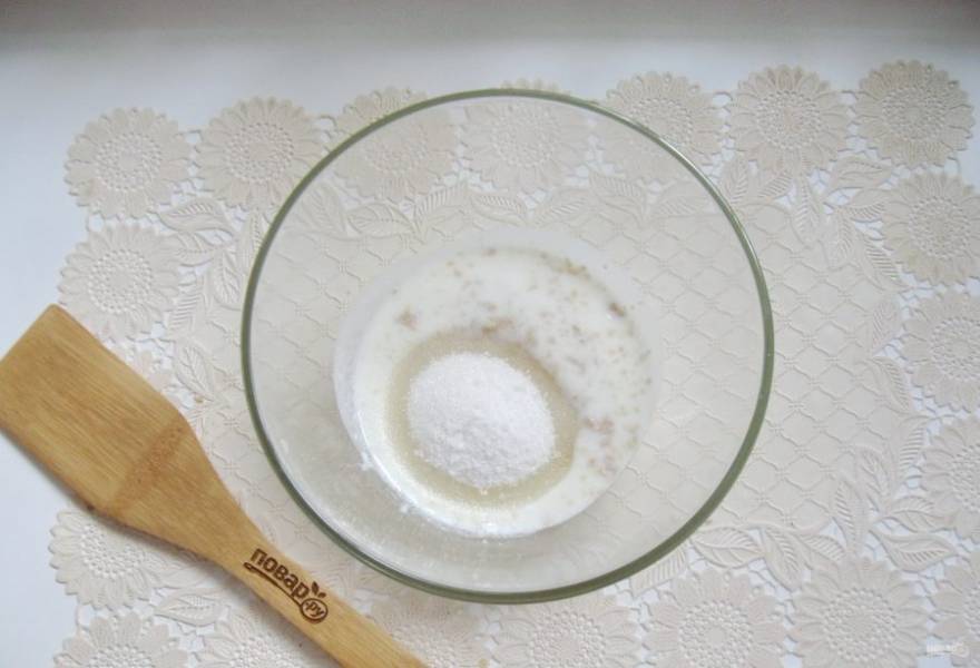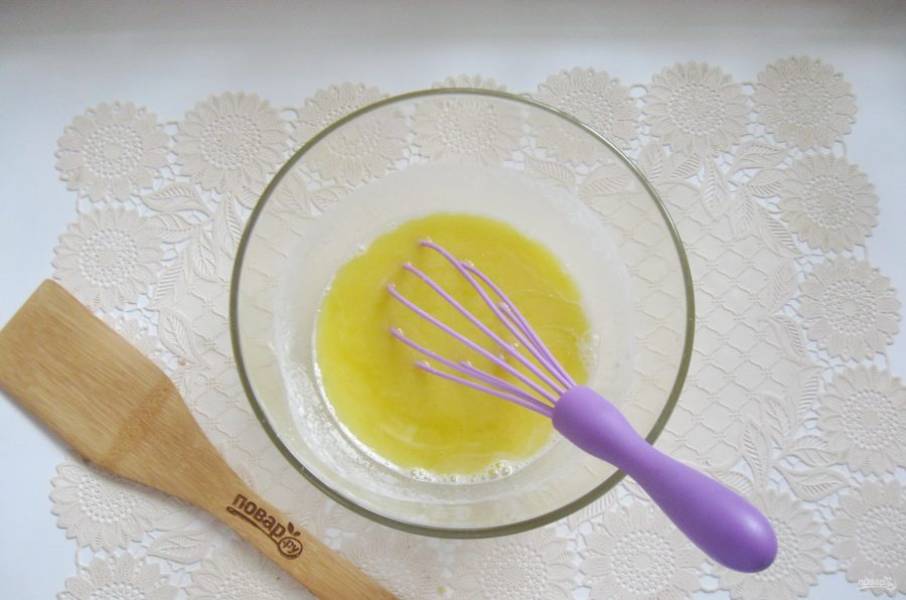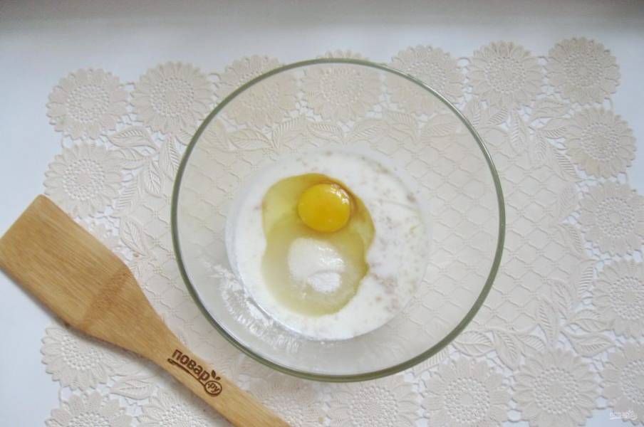 Влейте растопленное сливочное масло. Хорошо перемешайте венчиком кефир, дрожжи, соль, сахар, яйцо, масло и ванильный сахар.