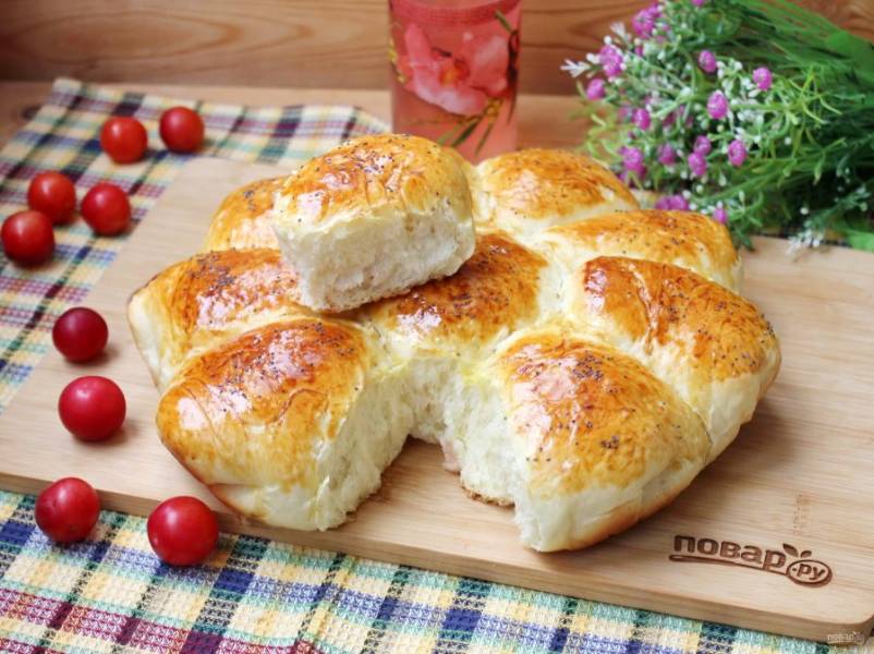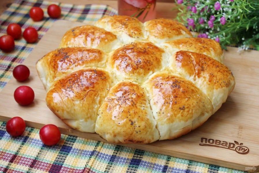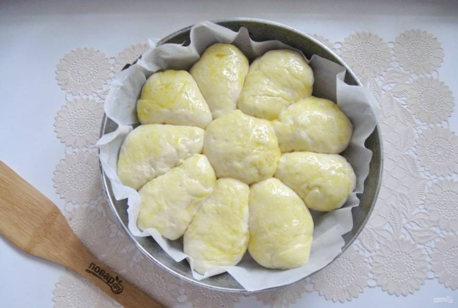 Выложите булочку посередине сковороды, а пирожки по краю. Дайте постоять пирогу в тепле 30-35 минут. Смажьте яйцом и отправьте в духовку, разогретую до 175 градусов.