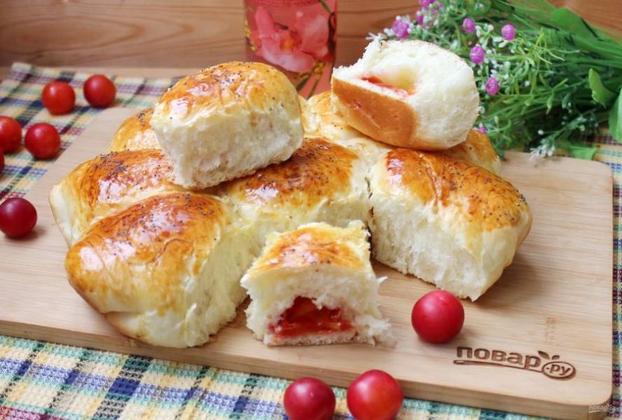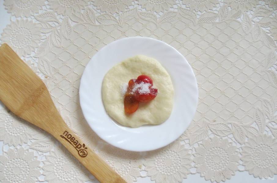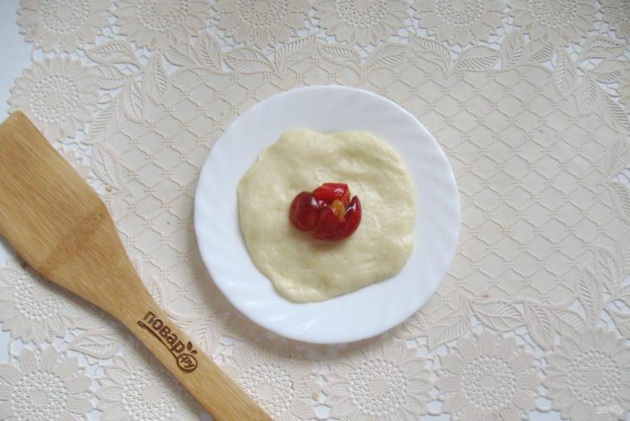 После тесто обомните и разделите на 10-11 шариков. Каждый шарик раскатайте в лепешку и выложите алычу без косточки.