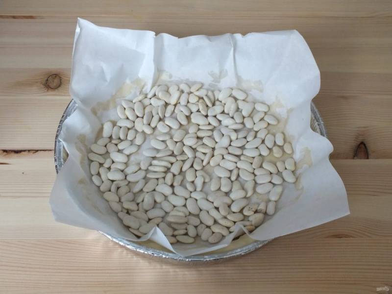 На тесто положите пищевой пергамент и насыпьте сверху фасоль или нут. Разогрейте духовку до 180 градусов. Поставьте форму с тестом в духовку и выпекайте 15-20 минут, до легкого румянца бортиков теста.