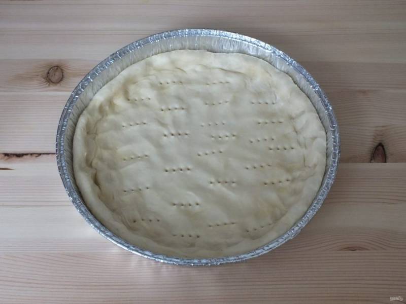 По истечении времени достаньте тесто из холодильника. Возьмите круглую форму, в диаметре 22-26 см. Если необходимо смажьте маслом. Тесто распределите по форме. Разомните руками как можно тоньше. От толщины теста зависит время выпечки. Сделайте проколы вилкой.