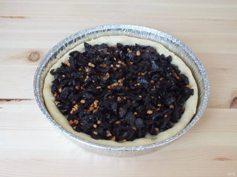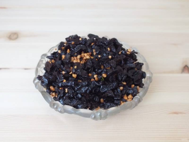 Подготовьте начинку. Чернослив нарежьте соломкой и смешайте с дроблеными орехами.