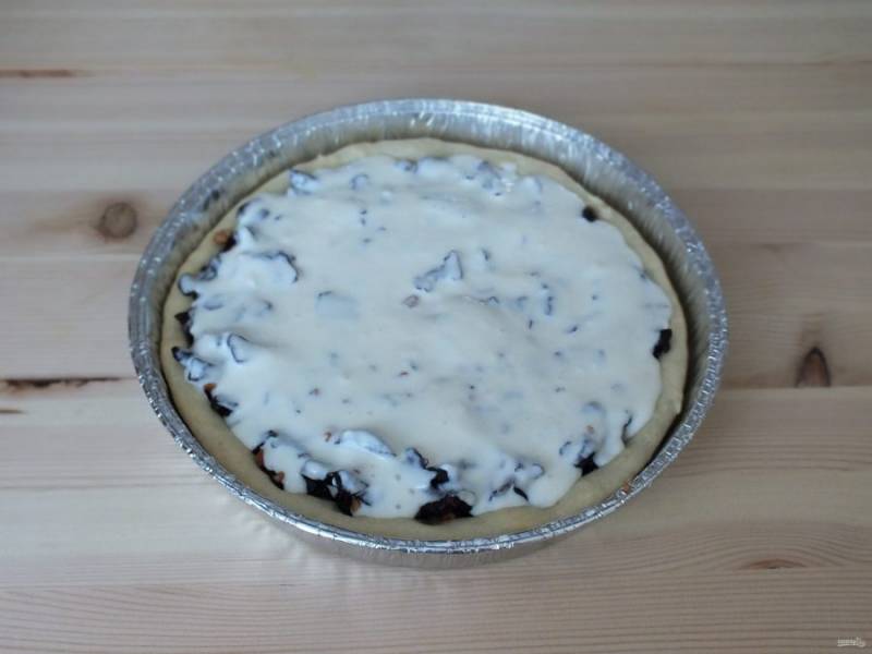Сверху залейте сметаной с сахаром. Поставьте обратно в духовку и выпекайте еще 30-40 минут при температуре 180 градусов.