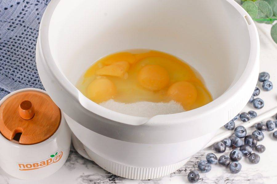 Вбейте куриные яйца в чашу кухонного комбайна, всыпьте туда же сахар, щепотку соли. Соль добавляйте обязательно, она подчеркивает сладость пирога. Взбейте все примерно 3-4 минуты на самой высокой скорости техники.