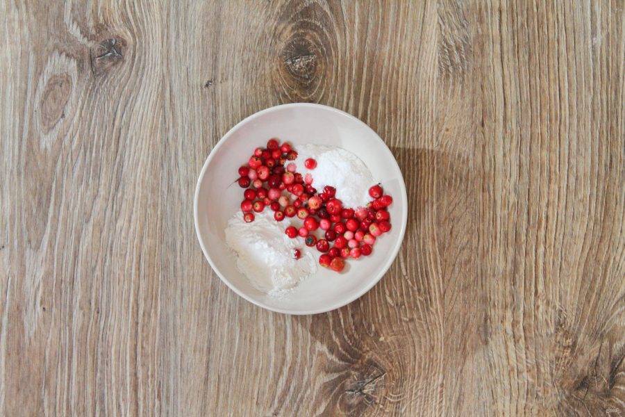 В миску выложите бруснику, сахарную пудру и крахмал.