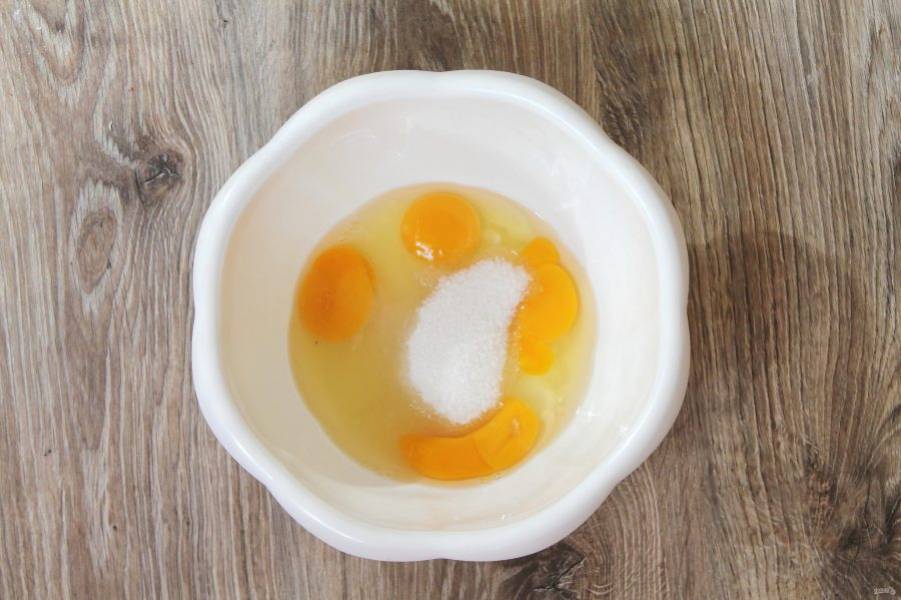 В миску вбейте яйца, и добавьте сахар.