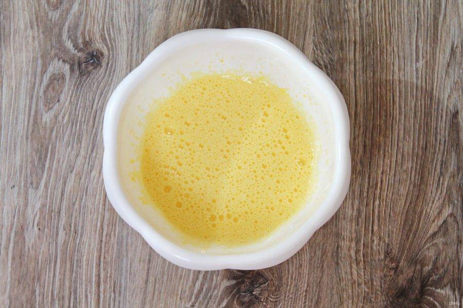 Взбейте яйца с сахаром миксером до пышной массы. У меня яйца домашние, поэтому масса получилась такой желтой.