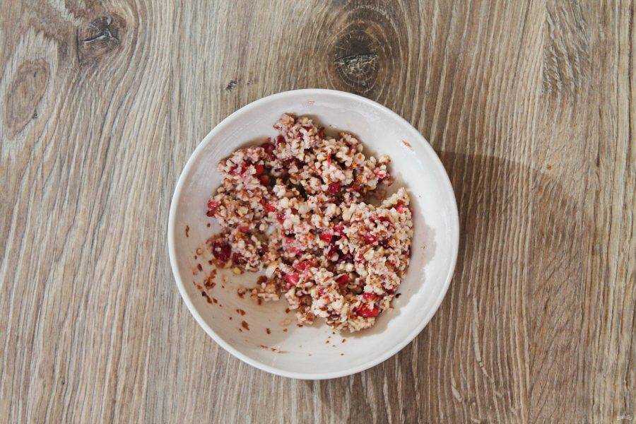 Все перемешайте, немного подавив бруснику, чтобы получилась масса, которая не рассыпается.