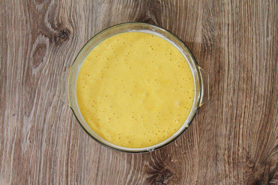 Во взбитые яйца просейте муку через мелкое сито. Аккуратно перемешайте до однородного пышного теста.