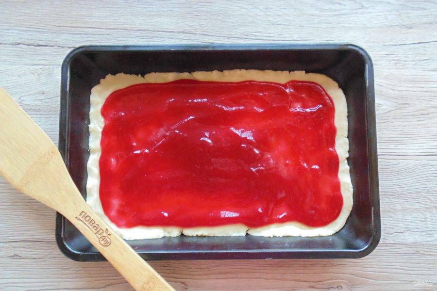 Большую часть теста достаньте из холодильника и распределите по форме для запекания.