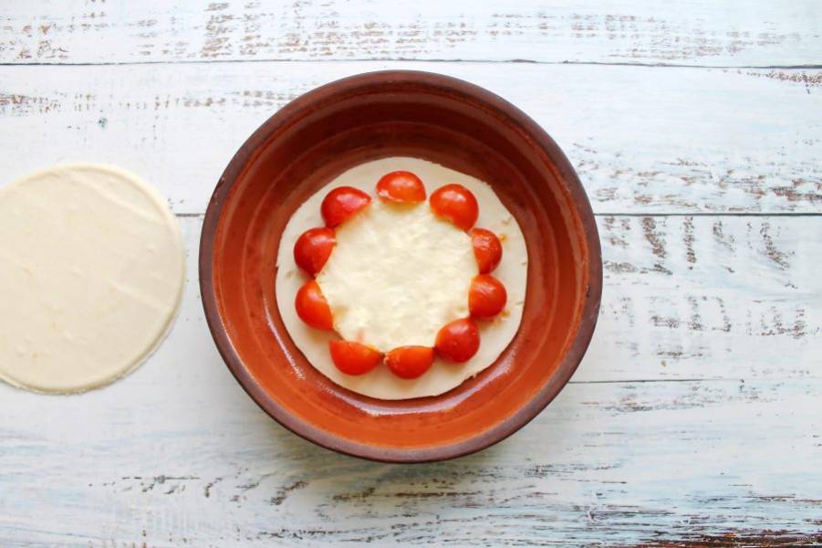 Противень или подходящую форму смажьте растительным маслом и выложите одну часть теста. На середину выложите шайбу сыра, а по кругу выложите помидоры черри.