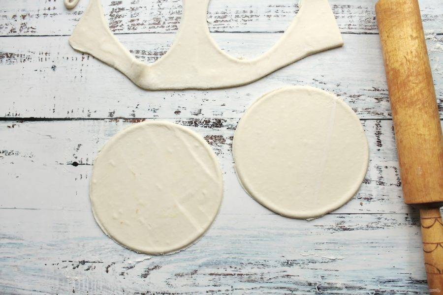 Слоеное тесто раскатайте на присыпанном мукой столе и вырежьте два круга больше диаметра сыра на 5-6 сантиметров.