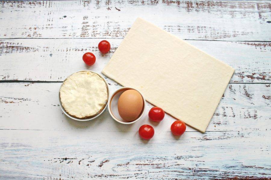 Подготовьте все необходимые ингредиенты для приготовления пирога с камамбером и помидорами черри. Тесто достаньте заранее и разморозьте, черри вымойте и обсушите.