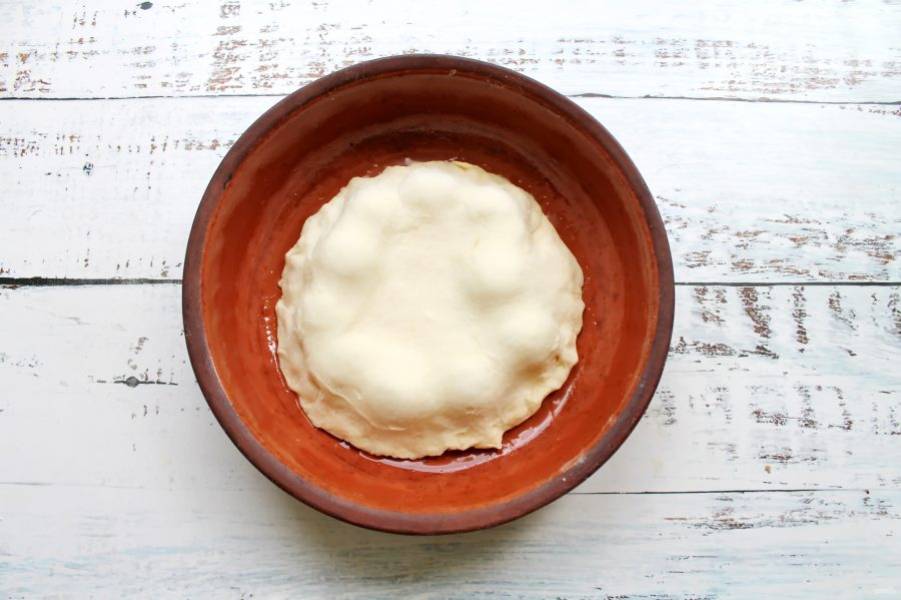 Сверху выложите второй круг теста и тщательно защипайте по всему краю. Яйцо перемешайте и смажьте пирог.