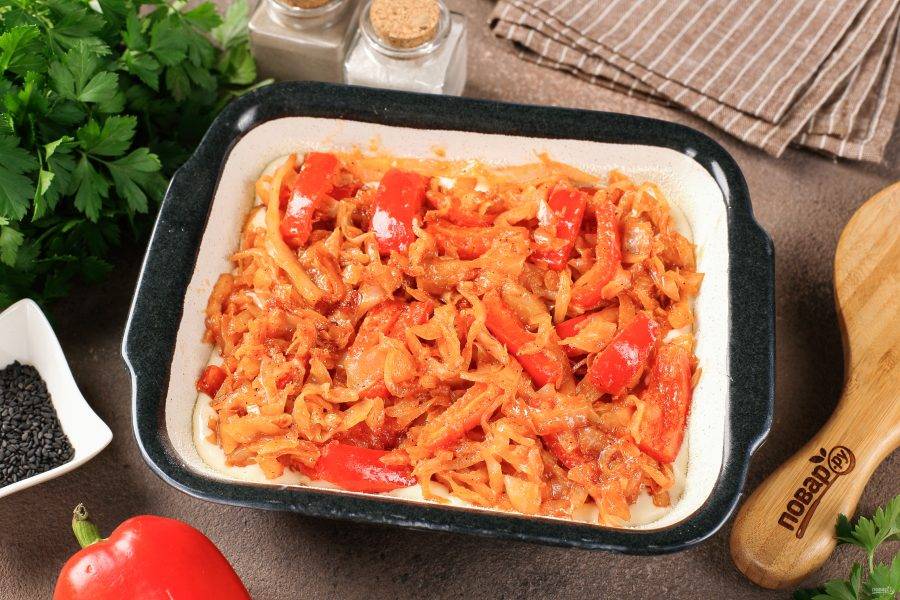 Жаропрочную форму смажьте маслом. Дно и бока присыпьте мукой или манкой. Вылейте примерно половину порции теста и сверху равномерно распределите начинку.