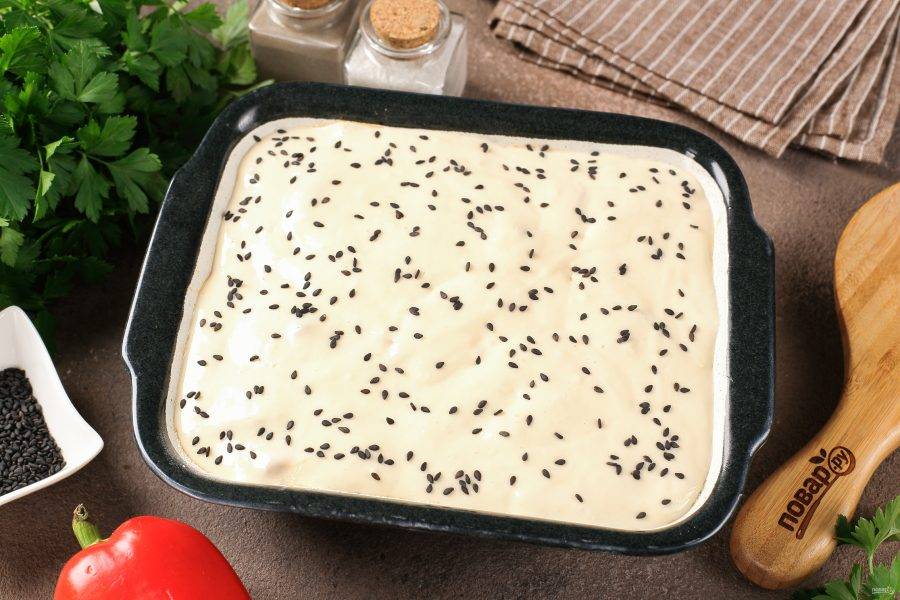 Полейте начинку оставшимся тестом и посыпьте кунжутом. Выпекайте при температуре 180 градусов около 30 минут.