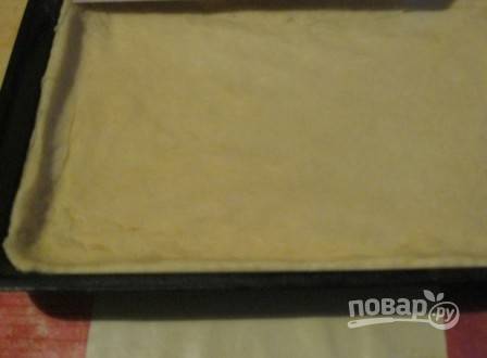 Раскатываем тесто в пласт толщиной примерно 7-8 мм. Слегка смазываем форму маслом и выкладываем пласт теста, формируя бортики.