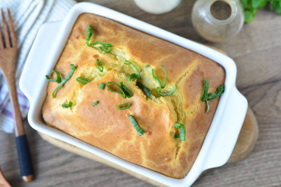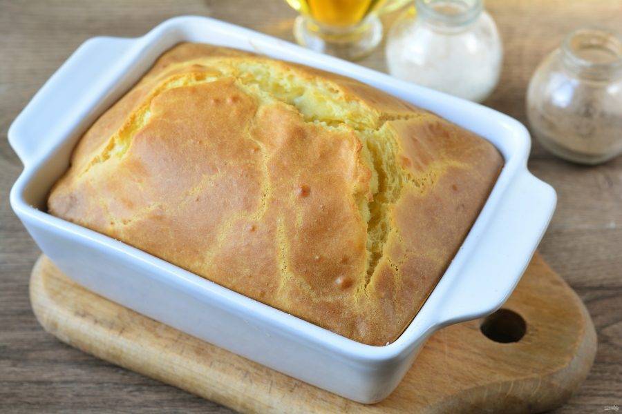 Через 35-40 минут пирог станет пышным и румяным, доставайте его из духовки.