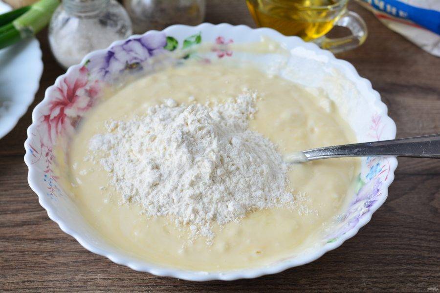 Добавьте остатки муки и перемешайте тесто, чтобы не было комочков. Тесто будет густоватым как на оладьи.