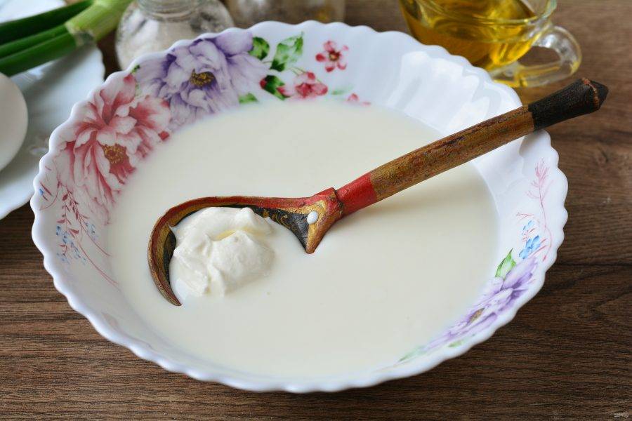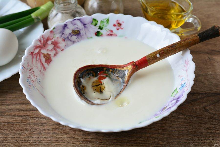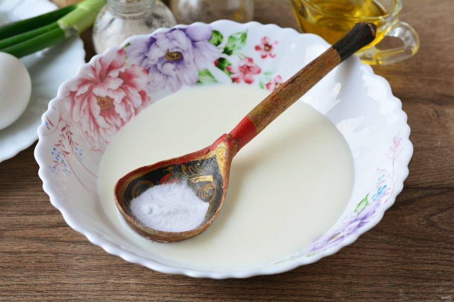 Влейте кефир в миску, всыпьте к нему соду, соль и сахар, перемешайте. Сода начнет активно работать в кислой среде.