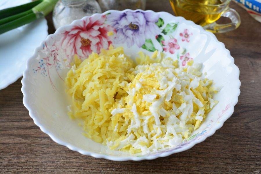Для начинки отварите картофель до мягкости. Почистите от кожуры. Также сварите вкрутую куриное яйцо. Натрите на терке картофель и яйца. Смешайте в миске начинку, добавьте специи по вкусу.