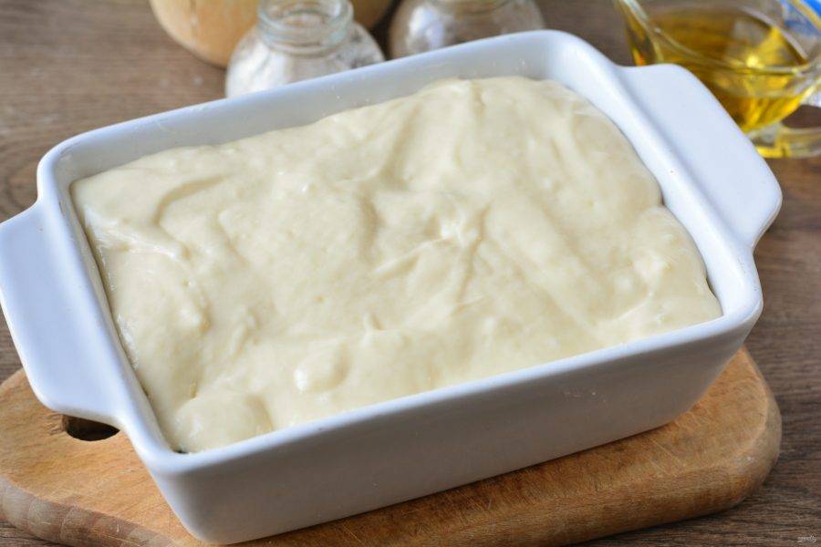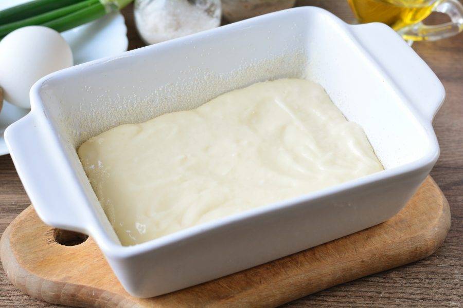 В форму для запекания налейте половину порции теста. Если боитесь, что пирог прилипнет, можете смазать бока маслом и присыпать сухарями или манкой.