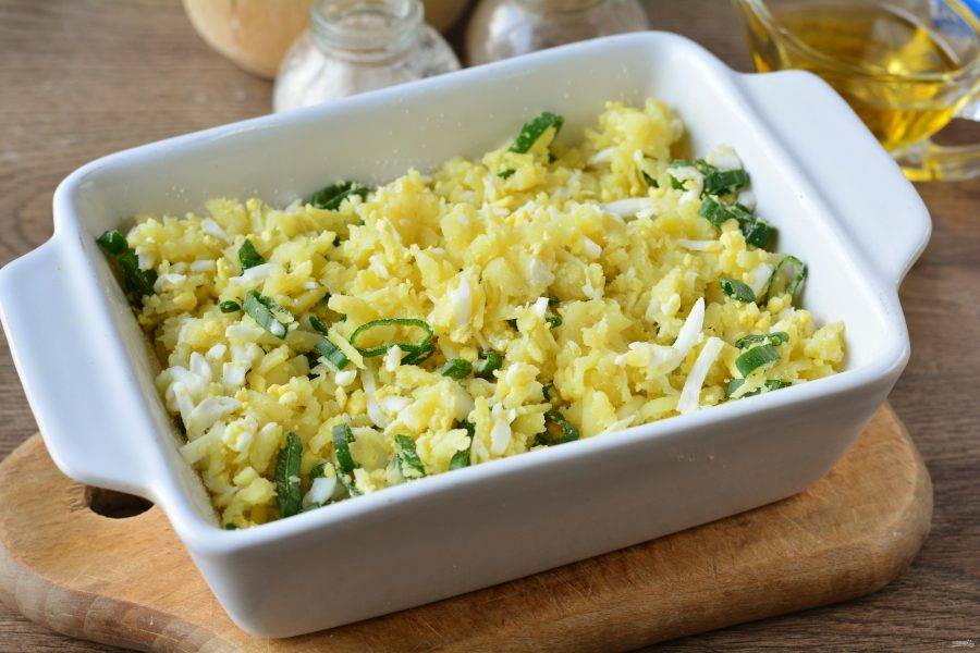 Добавьте в начинку мелко рубленый зеленый лук и перемешайте. Начинка готова.