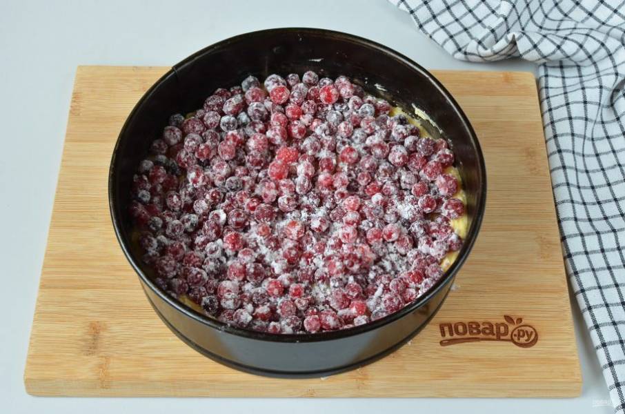 Вымытую клюкву перемешайте с крахмалом. Сладкоежкам рекомендую добавить сахарную пудру к ягодам, пару столовых ложек без горки, не больше. Распределите равномерно клюкву в крахмале по тесту.
