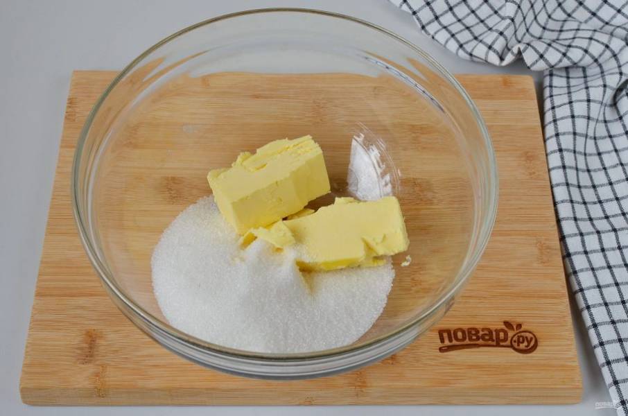 Масло поставьте на 15 секунд в микроволновку, чтобы оно немного размягчилось, но не растаяло. Добавьте сахар, миксером взбейте массу до однородности.