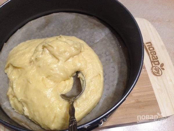 5. Застилаем дно формы для выпечки (24 см) пергаментом, а бока смажем сливочным или растительным маслом. Выкладываем и разравниваем тесто.
