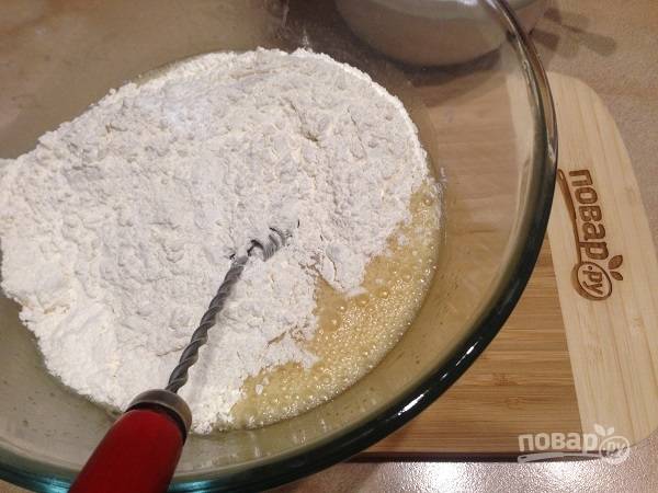 4. Добавляем муку, смешанную с разрыхлителем и размешиваем до однородности. Тут уже лучше работать ложкой, тесто получается довольно густым.