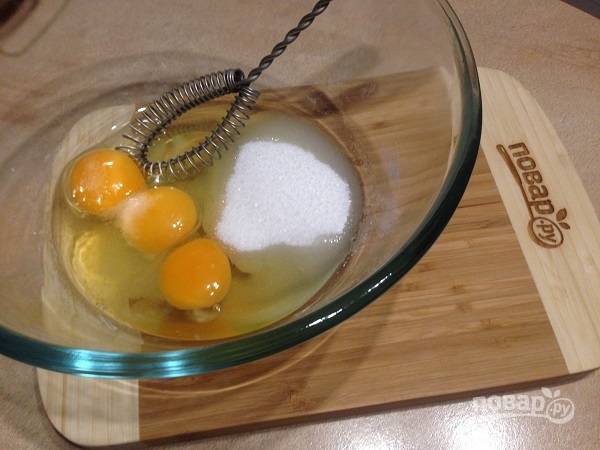 2. Слегка взбиваем венчиком яйца с сахаром обычным и ванильным и солью.