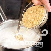 Налить 250 мл в кастрюлю, довести до кипения. Варить рис в молоке около 18-20 минут. Добавить немного сахара. Доливать молоко по мере впитывания/выкипания. В конечном итоге рис должен быть абсолютно сухим.